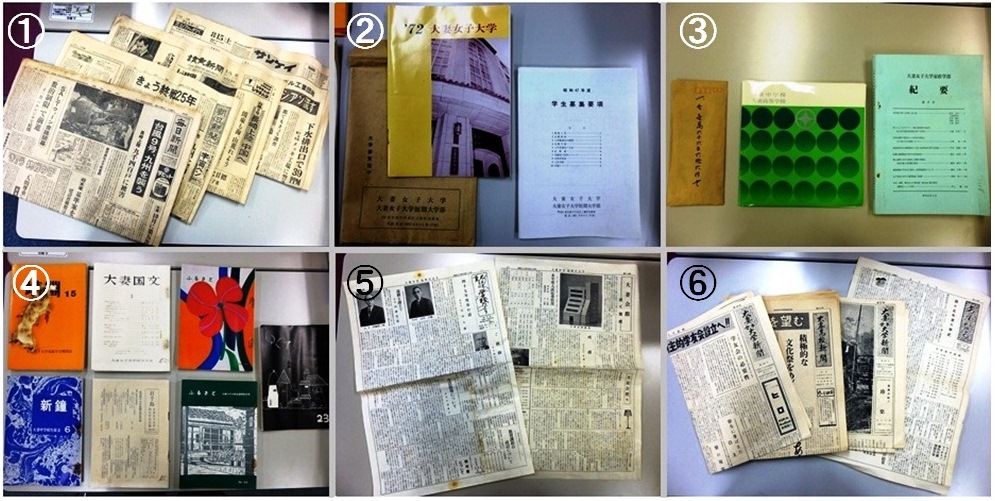 ①1970年8月15日付新聞4紙 ②(左から)1972年度大学要覧、学生募集要項 ③(左から)封筒に入ったお金16,666円、大妻中学高等学校案内、紀要 ④学部学会誌等 ⑤学校だより ⑥大妻女子大学新聞等