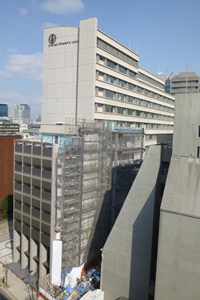 千代田キャンパス再開発プロジェクト1期工事現場では、先日1・2工区の南側部分から始まったPC板の外壁を鉄骨間に組み込む工事が1工区東側部分まで及び、英大使館裏通りの歩道に立つと、紫がかったベージュ色の外壁が目にできるようになりました=写真右。今は武骨な鉄骨が目立つ新校舎建築現場ですが、すべて温かみのある外壁で覆われる日が楽しみです。