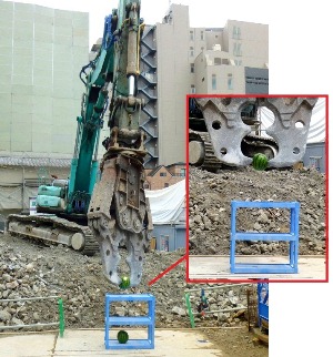 これは、現在、作業が進む旧本館と記念会館の解体工事で活躍するコンクリート圧砕機(解体専用のショベルカー)を使って、スイカを割らずに持ち上げるというもの=写真。同工事を担当する戸田建設が「安全週間」の一環として実施しました。