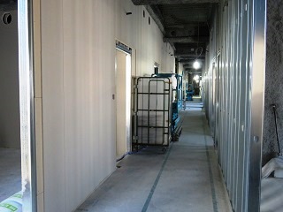 まずモデルルームとして2階に1室だけ先行して作ったキャリア支援資料室の壁・天井・窓枠等の内装を点検し=写真右、次いで2階北側の事務室、3階北側の情報処理教室や、本学では初の設置となるエスカレーターの工事現場を確認しました。