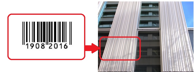外壁のスパンドレル(金属化粧板)にある凹凸。普段、見逃してしまいがちなこの外壁の凹凸に、ある秘密が隠されています――。 実はこれ、8桁のバーコードがデザインされたもので、創立者・大妻コタカが裁縫・手芸の家塾を開設した1908年とH棟竣工の2016年をつなげた数字の「19082016」になっていて、学院のこれまでの歩みを表しているのです。